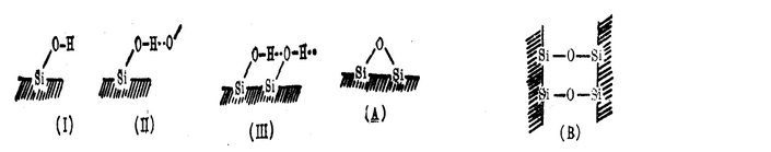層析硅膠為一多孔性物質,可用通式Si02·xH20表示.它具有多孔性的硅氧環(huán)的交鍵結構,由于其骨架表面具有很多游離(I)、鍵合(Ⅱ)和鍵合—活性(III)狀態(tài)的硅醇基·(silanol)基團它能夠通過氫鍵與極性或不飽和分子相互作用,同時能吸附多量的水分.當加熱活化(100一110℃)時,硅膠表面因氫鍵所吸附的水分能可逆地被除去;但溫度升高**500℃時,硅膠表面的硅醇基進一步脫水縮合轉變?yōu)楣柩跬殒I即硅氧環(huán)表面(A)及稠合環(huán)氧環(huán)烷(B),從而喪失了因氫鍵吸附水分的活性不再具有吸附劑的性質.若用水處理亦不能恢復其吸附活性