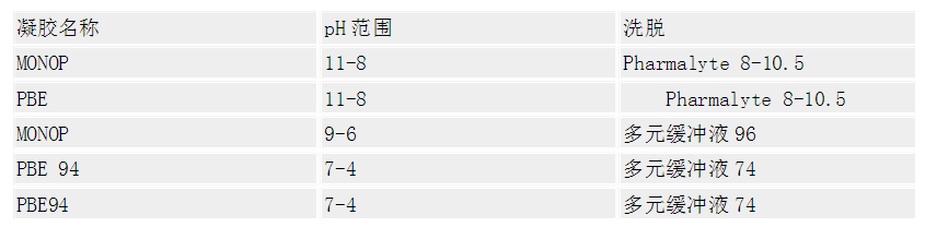 多元緩沖液交換劑PBE,屬珠狀交換劑凝膠,有PBe 118(pH11-8)和PBE(pH9-4)。在聚焦層析時,通過使用不同的洗脫液,可使交換容量發生改變,并且使pH達到更廣的范圍。