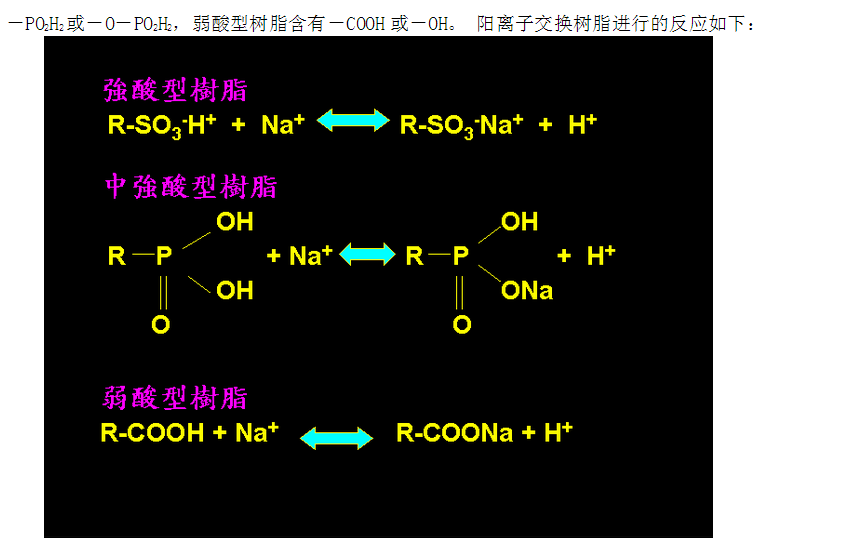 -PO2H2或-O-PO2H2,弱酸型樹脂含有-COOH或-OH。 陽離子交換樹脂進行的反應如下: