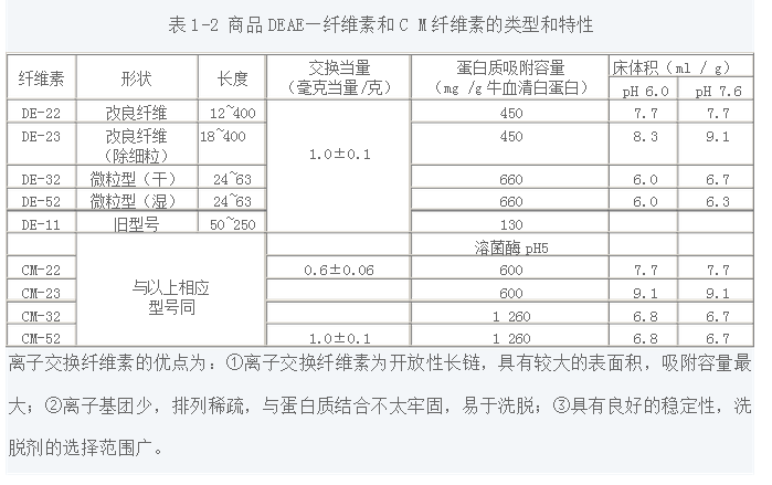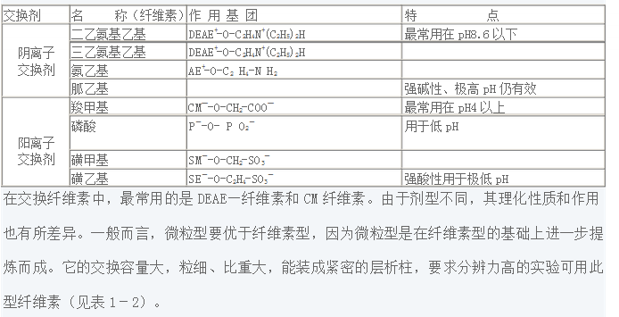 1.離子交換纖維素 離子交換纖維素的種類很多,其種類與特性如表1-1所示。