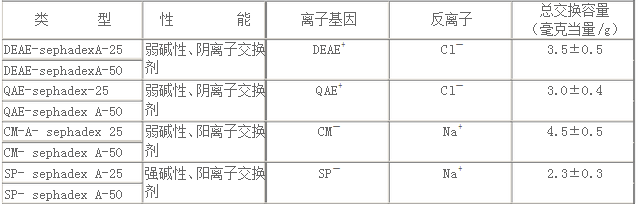 2.離子交換交聯葡聚糖 離子交換交聯葡聚糖也是廣泛使用的離子交換劑,它與離子交換纖維素不同點是載體不同,常用交聯葡聚糖的類型與特性見表1-3。