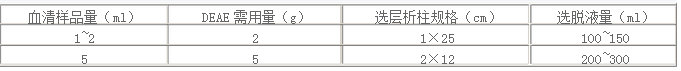 表1-4 分離的血清與所需DEAE—纖維素量及其他條件的大致關系