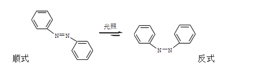 偶氮苯有順反兩種異構體,多種情況下以反式形式存在,但在日光或紫外光照射下,反式可以部分轉化成順式。