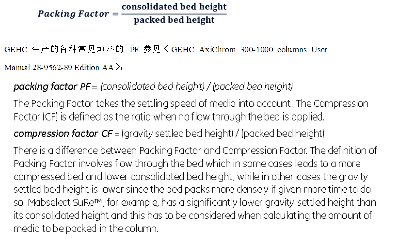 填料因子(Packing Factor, PF):指在在裝柱過程中,用低流速(如60cm/h)對填料進行沉降壓縮得到的調料高度和**后裝柱完成時填料高度(柱高)的比值,
