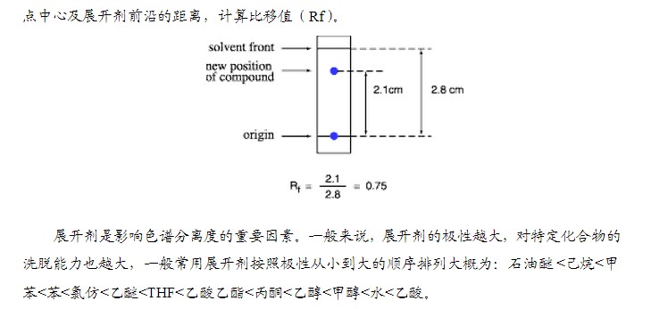 一個化合物在吸附劑上移動的距離與展開劑在吸附劑上移動的距離的比值稱為該化合物比移值Rf