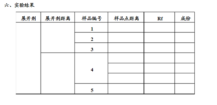 展開:展開劑選擇;展開方法——傾斜上行法。取一有蓋的廣口瓶作色譜器,加入展開劑(用環己烷︰乙酸乙酯=3~5︰1),展開劑高度不要超過5mm,以免淹沒斑點,然后將已點好樣品的薄層板放入色譜器中,蓋緊,等展開劑上升到接近薄層板上沿時,打開蓋子,迅速用鉛筆或小針在前沿作一記號取出,晾干。