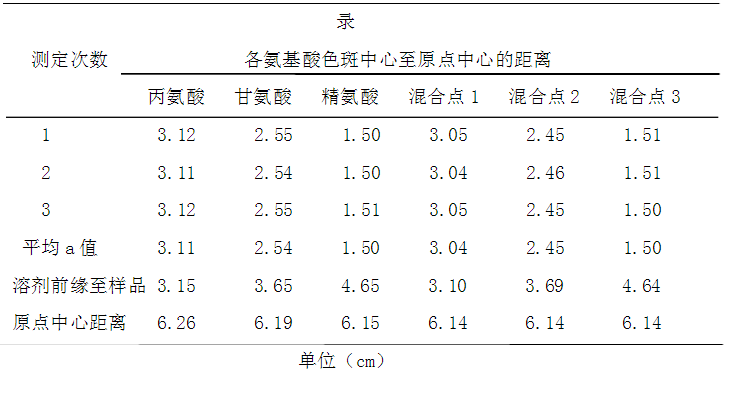表1各氨基酸色斑中心**樣品原點(diǎn)中心距離及溶劑前緣**樣品原點(diǎn)中心距離記