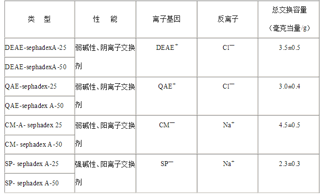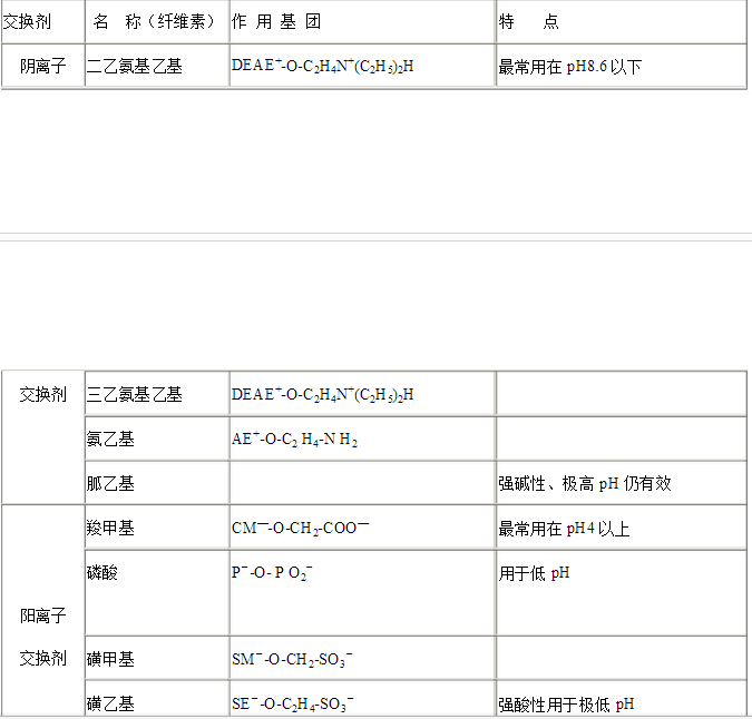在纖維素與葡聚糖分子上結合有一定的離子基團,當結合陽離子基團時,可換出陰離子,則稱為陰離子交換劑。如二乙氨乙基(Dicthylaminoethyl,DEAE)纖維素。在纖維素上結合了DEAE,含有帶正電荷的陽離子纖維素—O—C6 H14N+H,它的反離子為陰離子(如Cl-等),可與帶負電荷的蛋白質陰離子進行交換。當結合陰離子基團時,可置換陽離子,稱為陽離子交換劑,如羧甲基(Carboxymethy, CM)纖維素。纖維素分子上帶有負電荷的陰離子(纖維素-O-CH2-COO一