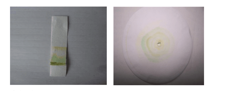 當推動劑前沿接近濾紙上端邊緣時,取出濾紙,自然晾干,觀察色帶的分布:四種色素在濾紙上的移動速度是胡蘿卜素(橙黃色)>葉黃素(黃色)>葉綠素a(藍綠色)>葉綠素b(黃綠色)。 七、