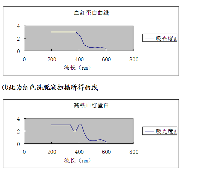 ②此為高鐵血紅蛋白稀釋10倍后掃描所得曲線 3、討論