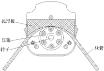 [4],靠密封的工作容積的變化進行工作,所輸送的液體、氣體、漿狀物料等在密閉的軟管內流動。軟管從泵頭的一端伸到另一端,在弧形壓力板的作用下被擠向壓輥。所有的壓輥均勻地固定在轉子周圍,驅動器驅動轉子轉動,從而使壓輥